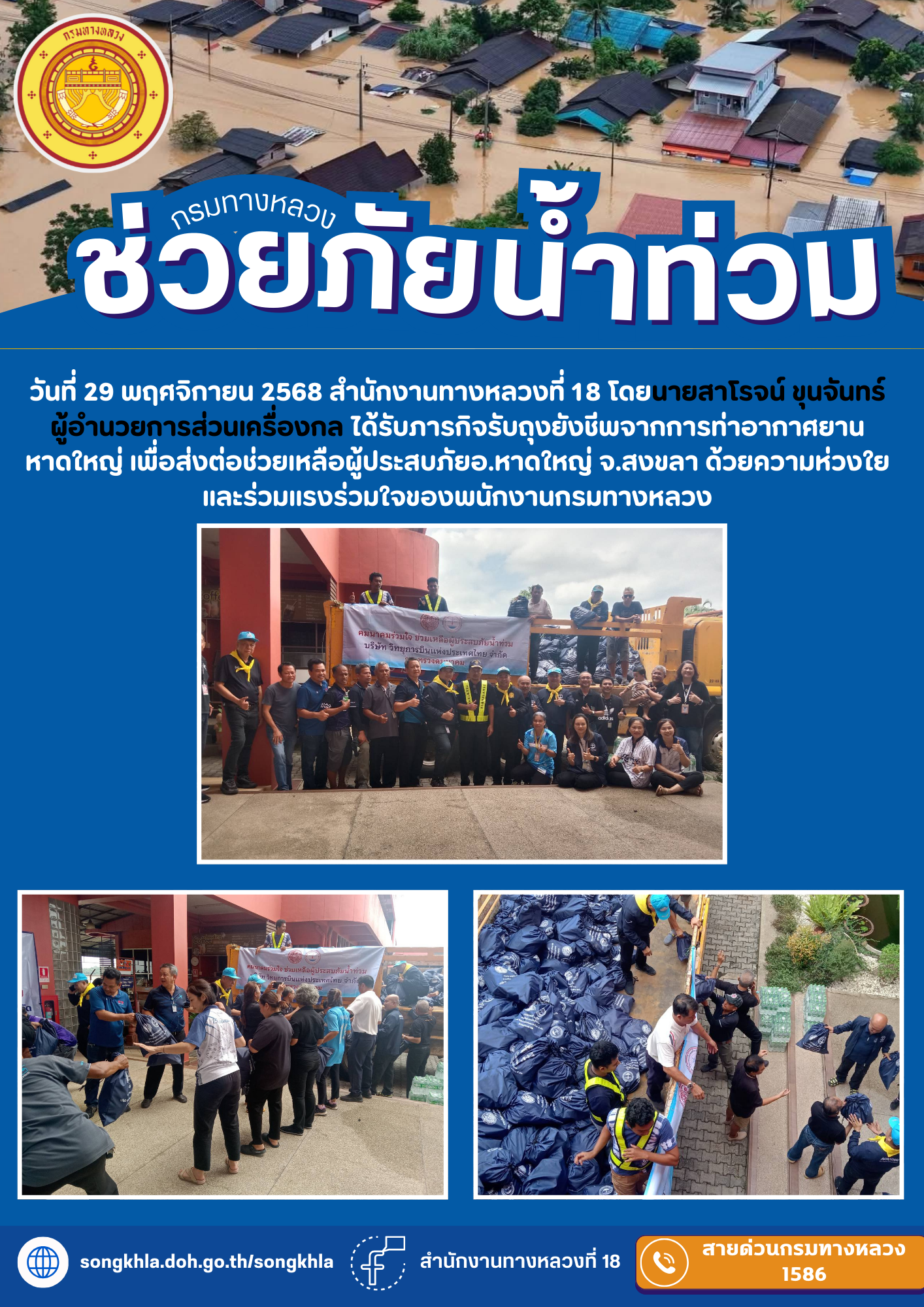 สำนักงานทางหลวงที่ 18 โดยนายสาโรจน์ ขุนจันทร์ ผู้อำนวยการส่วนเครื่องกล ได้รับภารกิจรับถุงยังชีพจากการท่าอากาศยานหาดใหญ่ เพื่อส่งต่อช่วยเหลือผู้ประสบภัยอ.หาดใหญ่ จ.สงขลา