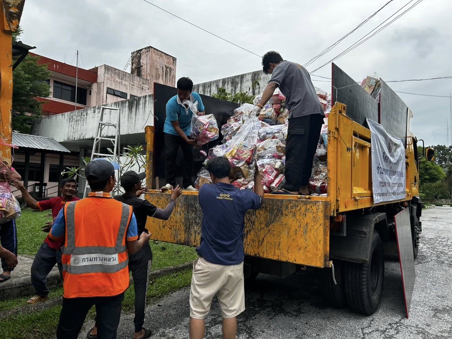 รถคาราวานกรมทางหลวง โดยเจ้าหน้าที่ฯ ได้รับภารกิจส่งถุงยังชีพและน้ำดื่มอย่างละ 1 คันรถ ไปยังแขวงทางหลวงนราธิวาส