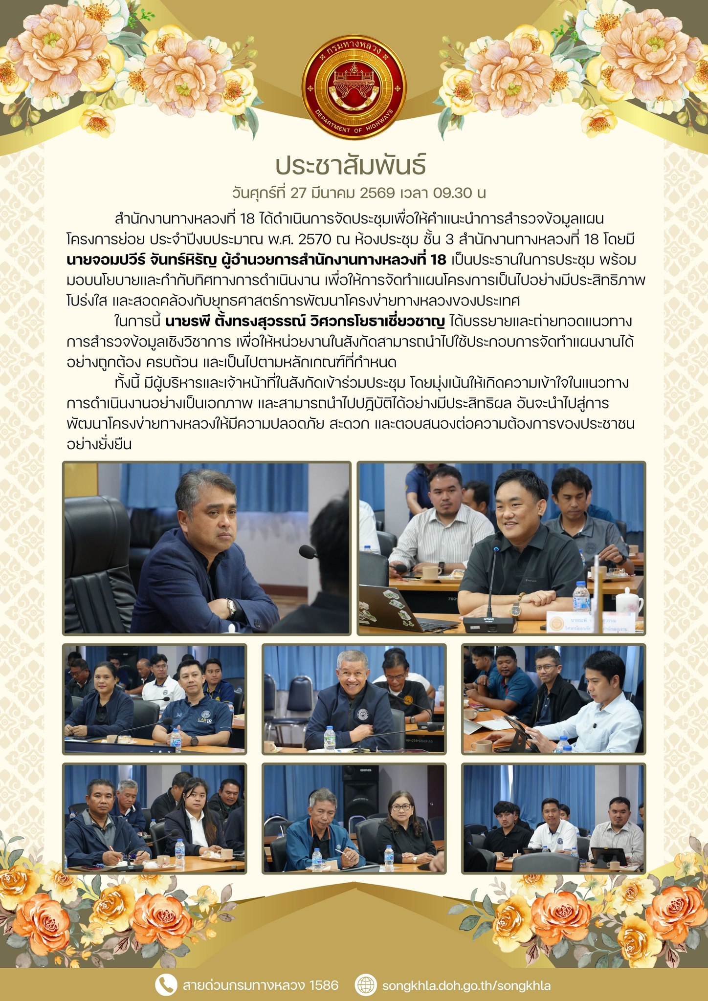 วันศุกร์ที่ 27 มีนาคม 2569 เวลา 09.30 น.นายจอมปวีร์ จันทร์หิรัญ ผู้อำนวยการสำนักงานทางหลวงที่ 18 เป็นประธานในการประชุม พร้อมทั้งมอบนโยบายและกำกับทิศทางการดำเนินงานให้แก่หน่วยงานในสังกัด เพื่อให้การจัดทำแผนโครงการเป็นไปอย่างมีประสิทธิภาพ โปร่งใส และสอดคล้องกับยุทธศาสตร์การพัฒนาโครงข่ายทางหลวงของประเทศ ตลอดจนรองรับการพัฒนาโครงสร้างพื้นฐานด้านคมนาคมขนส่งอย่างเป็นระบบและยั่งยืน