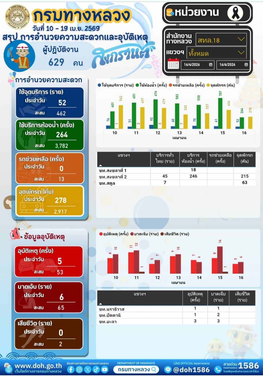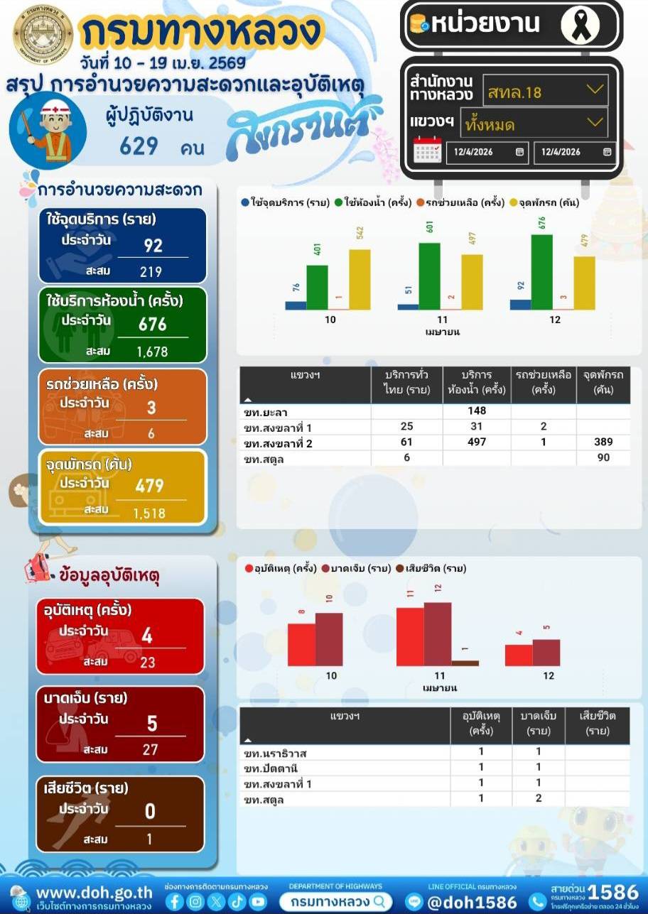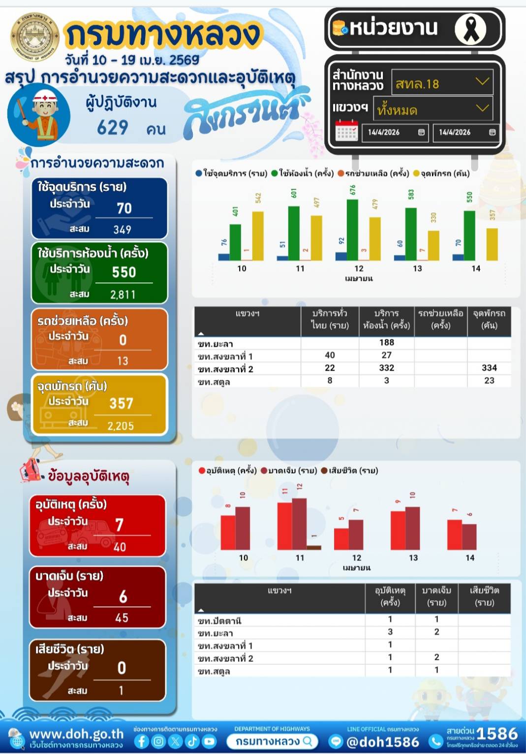 ข้อมูลข่าว : รายงานสรุปการเกิดอุบัติเหตุและการให้บริการประชาชน ช่วงเทศกาลสงกรานต์ 2569 ระหว่างวันที่ 10-15 เมษายน 2569