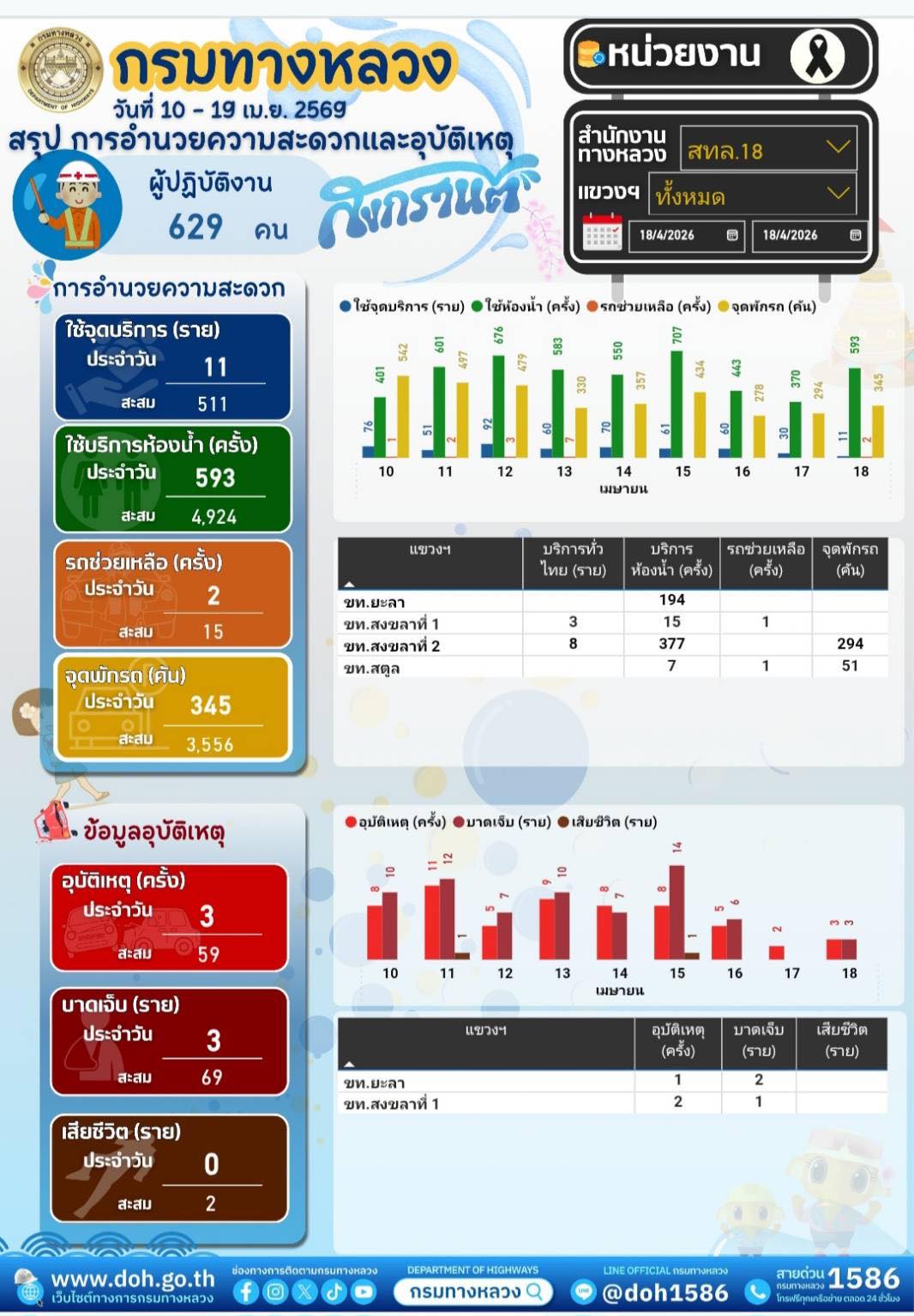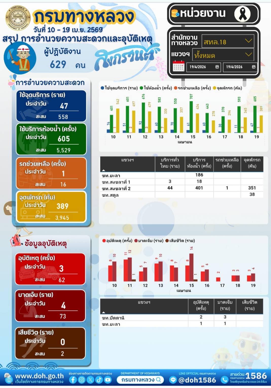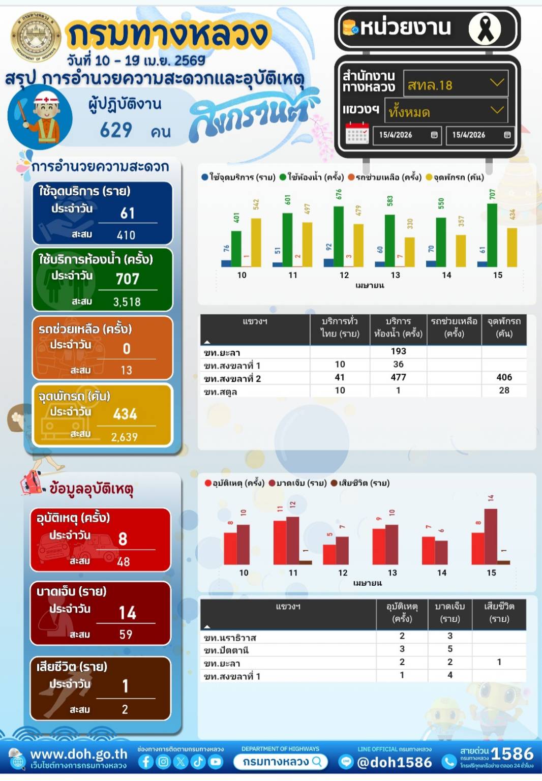 ข้อมูลข่าว : รายงานสรุปการเกิดอุบัติเหตุและการให้บริการประชาชน ช่วงเทศกาลสงกรานต์ 2569 ระหว่างวันที่ 10-15 เมษายน 2569