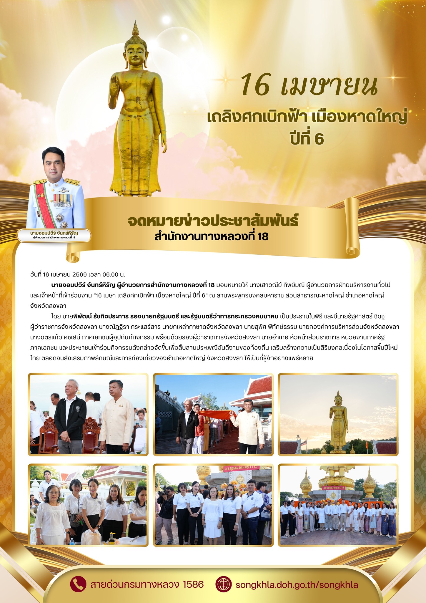 นายจอมปวีร์ จันทร์หิรัญ ผู้อำนวยการสำนักงานทางหลวงที่ 18 มอบหมายให้ นางเสาวณีย์ ทิพย์มณี ผู้อำนวยการฝ่ายบริหารงานทั่วไป และเจ้าหน้าที่เข้าร่วมงาน “16 เมษา เถลิงศกเบิกฟ้า เมืองหาดใหญ่ ปีที่ 6” ณ ลานพระพุทธมงคลมหาราช สวนสาธารณะหาดใหญ่ อำเภอหาดใหญ่ จังหวัดสงขลา