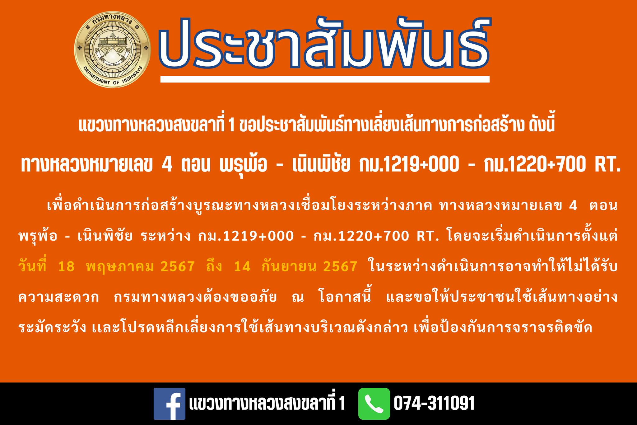 ประชาสัมพันธ์ทางเลี่ยงเส้นทางการก่อสร้างทางหลวง