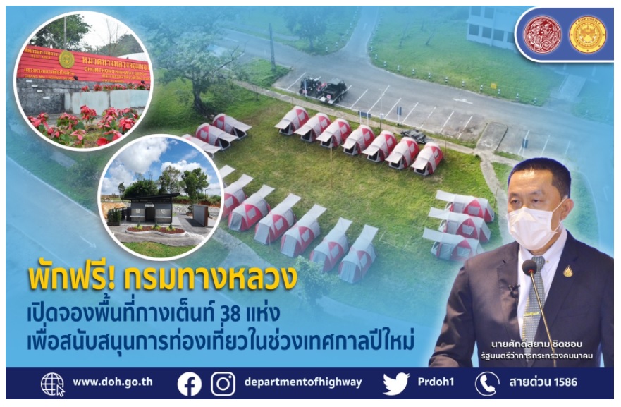 นายสราวุธ ทรงศิวิไล อธิบดีกรมทางหลวง เปิดเผยว่า กรมทางหลวงได้ขานรับนโยบายการเปิดประเทศตั้งแต่วันที่ 1 พ.ย. 64 ที่ผ่านมา ของนายศักดิ์สยาม ชิดชอบ รัฐมนตรีว่าการกระทรวงคมนาคม ในการสนับสนุนการท่องเที่ยวภายในประเทศทำให้มีประชาชนเดินทางไปท่องเที่ยวพักผ่อนรับลมหนาวโดยเฉพาะทางภาคเหนือและจังหวัดท่องเที่ยวเป็นจำนวนมาก กรมทางหลวงจึงได้จัดเตรียมจุดบริการกางเต็นท์ทั่วประเทศ จำนวน 38 แห่ง แบ่งเป็นภาคเหนือ 30 แห่ง ภาคตะวันออกเฉียงเหนือ 3 แห่ง ภาคตะวันตก 3 แห่ง ภาคกลาง 2 แห่ง เพื่ออำนวยความสะดวกและรองรับการท่องเที่ยวของประชาชน โดยพื้นที่กางเต็นท์แต่ละแห่งจะตั้งอยู่ในพื้นที่ความรับผิดชอบของหมวดทางหลวงซึ่งจะมีเจ้าหน้าที่คอยอำนวยความสะดวกและให้บริการประชาชนตลอด 24 ชั่วโมง พร้อมบริการน้ำดื่ม ห้องสุขา และสอบถามข้อมูลทางหลวง