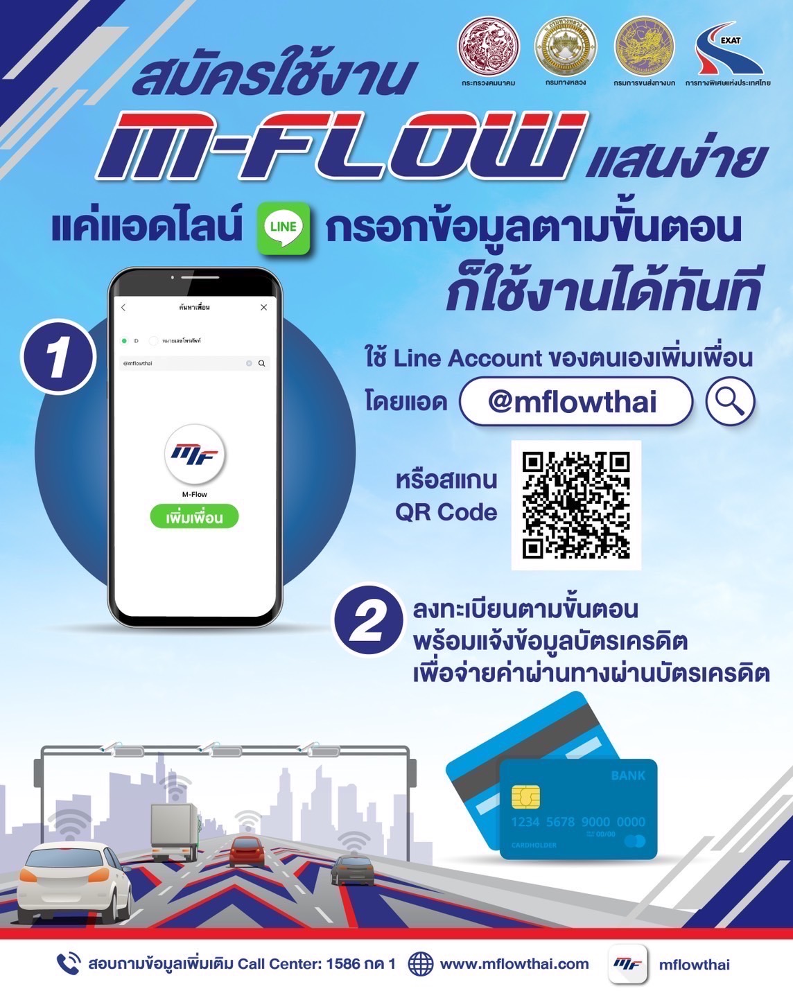 อธิบดีกรมทางหลวงเน้นย้ำว่า “ระบบ M-Flow คือ ระบบที่ใช้เทคโนโลยี AI ที่ทันสมัยที่สุดเป็นครั้งแรกในประเทศไทย ผู้ใช้ช่องทาง M-Flow นี้ เมื่อผ่านบริเวณด่านเก็บเงิน ไม่ต้องชะลอความเร็ว วิ่งผ่านด่านฯ ได้เลย โดยจะไม่มีไม้กั้นที่ช่องเก็บเงิน และเมื่อใช้งานผ่านด่านฯ แล้ว ค่อยจ่ายเงินภายหลัง ตามเงื่อนไขที่ลงทะเบียนสมัครสมาชิกไว้ สำหรับผู้ที่สามารถเข้ามาใช้ระบบ M-Flow ในช่องทางที่กําหนด ต้องเป็นผู้ที่ลงทะเบียนสมัครเป็นสมาชิก M-Flow เท่านั้น รถป้ายแดง รถป้ายเลอะเลือนไม่ชัดเจน หรือไม่ติดแผ่นป้ายทะเบียน ห้ามเข้ามาใช้ระบบ M-Flow จึงขอเชิญชวนให้รีบสมัครเป็นสมาชิกตามช่องทางต่างๆ ข้างต้นให้เรียบร้อยก่อน เมื่อสมัครเสร็จแล้ว ก็สามารถเข้าใช้บริการได้ทันทีในทุกด่านฯ โดยใช้ช่องทางขวาสุด สังเกตป้ายสัญลักษณ์ M-Flow ก่อนถึงด่านฯ และที่พื้นถนน ส่วนรถยนต์ที่ยังไม่ได้เป็นสมัครสมาชิก หากขับผ่านช่อง M-Flow เนื่องจากเกิดความสับสนช่องทางวิ่งหรือไม่ทันสังเกตป้ายเตือนต่างๆ ขอให้ท่านรีบดำเนินการชําระเงินย้อนหลังภายใน 2 วัน โดยสามารถตรวจสอบยอดค้างชำระและชำระเงินได้ 3 ช่องทาง ได้แก่ เวบไซต์ mflowthai.com, Mobile Application: MFlowThai และ Line OA: @mflowthai เพื่อแสดงว่าท่านไม่มีเจตนาหลีกเลี่ยงไม่ชำระค่าผ่านทาง หากไม่ชำระตามเวลาที่กำหนดจะถูกดำเนินคดีตามกฎหมาย ทั้งนี้ สําหรับรถยนต์ป้ายแดง หรือป้ายทะเบียนไม่ชัดเจน