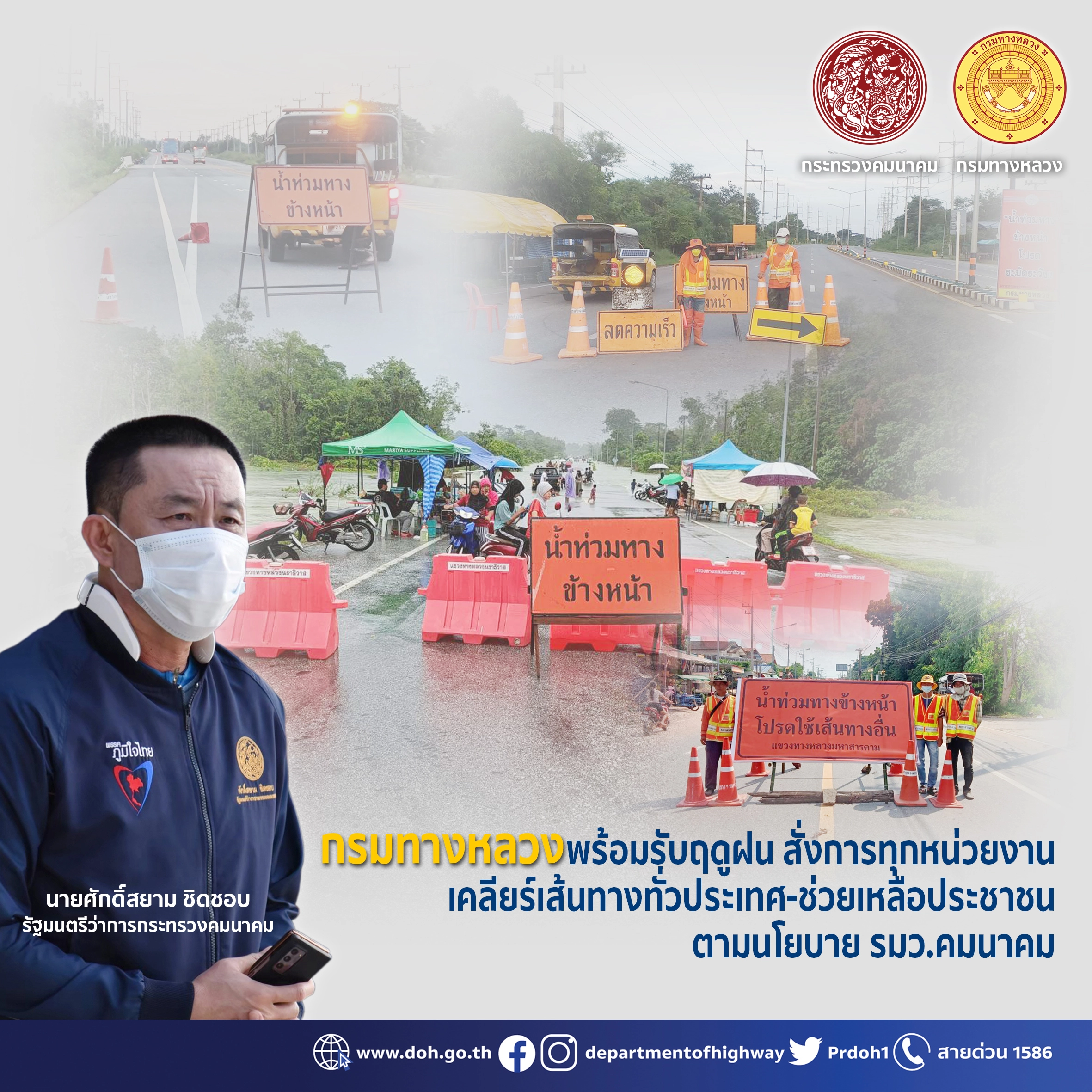 นายสราวุธ ทรงศิวิไล อธิบดีกรมทางหลวง เปิดเผยว่า นายศักดิ์สยาม ชิดชอบ รัฐมนตรีว่าการกระทรวงคมนาคม มอบให้หน่วยงานในสังกัดเตรียมพร้อมรับมือสถานการณ์อุทกภัยอย่างใกล้ชิดเนื่องจากกรมอุตุนิยมวิทยาได้ประกาศประเทศไทยเข้าสู่ฤดูฝนปี 2565 อย่างเป็นทางการในวันนี้ (13 พฤษภาคม 2565) และจะสิ้นสุดประมาณกลางเดือนตุลาคม 2565 นี้ ซึ่งอาจทำให้หลายพื้นที่เกิดสถานการณ์น้ำท่วมฉับพลัน น้ำป่าไหลหลาก เกิดวาตภัย ต้นไม้ล้มทับทาง ดินโคลนถล่ม ส่งผลกระทบต่อระบบคมนาคมขนส่งและการสัญจรของประชาชนผู้ใช้เส้นทาง และเพื่อเป็นการป้องกันและบรรเทาสถานการณ์ภัยพิบัติที่จะเกิดขึ้น จึงได้สั่งการให้ทุกหน่วยงานในสังกัดประกอบด้วย สำนักงานทางหลวง ศูนย์สร้างทาง ศูนย์สร้างและบูรณะสะพาน แขวงทางหลวง และหมวดทางหลวงทั่วประเทศ ดำเนินการตามมาตรการเตรียมความพร้อม เพื่ออำนวยความสะดวกและปลอดภัยให้กับประชาชนตามมาตรการ ดังนี้