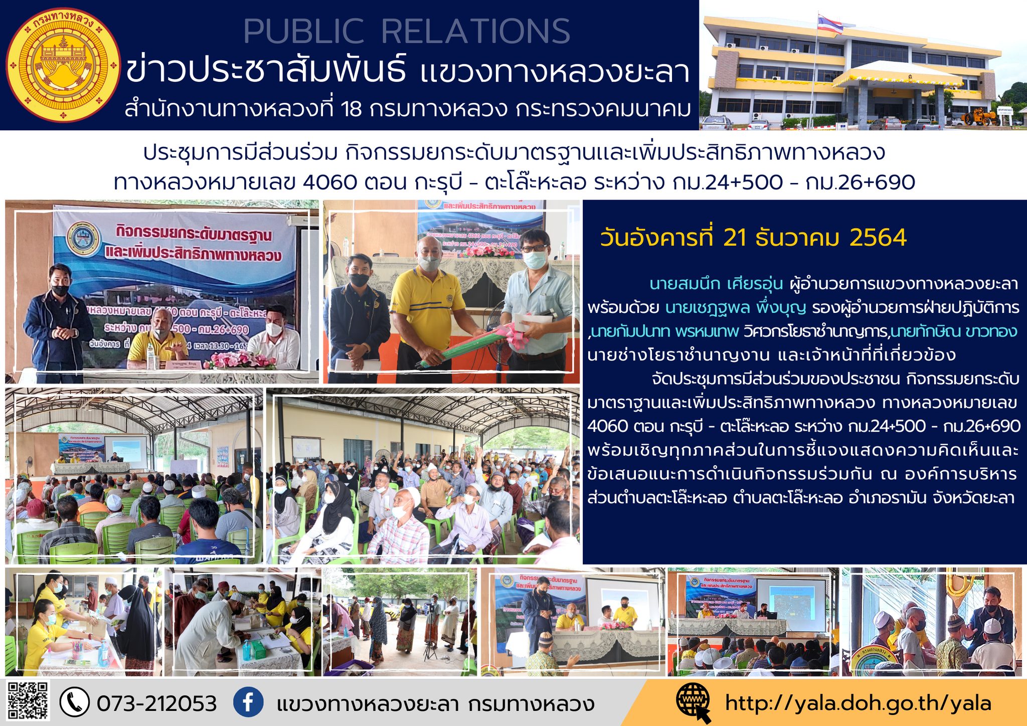 ในวันอังคาร ที่ 21 ธันวาคม 2564 เวลา 13.30 - 16.30 น. แขวงทางหลวงยะลา จัดการมีส่วนร่วมของประชาชน กิจกรรมยกระดับมาตราฐานและเพิ่มประสิทธิภาพทางหลวง ทางหลวงหมายเลข 4060 ตอน กะรุบี - ตะโล๊หะลอ ระหว่าง กม.24+500 - กม.26+690 เชิญทุกภาคส่วนในการชี้แจงแสดงความคิดเห็นและข้อเสนอแนะการดำเนินกิจกรรมร่วมกัน ณ องค์การบริหารส่วนตำบลตะโล๊ะหะลอ ตำบลตะโล๊ะหะลอ อำเภอรามัน จังหวัดยะลา
