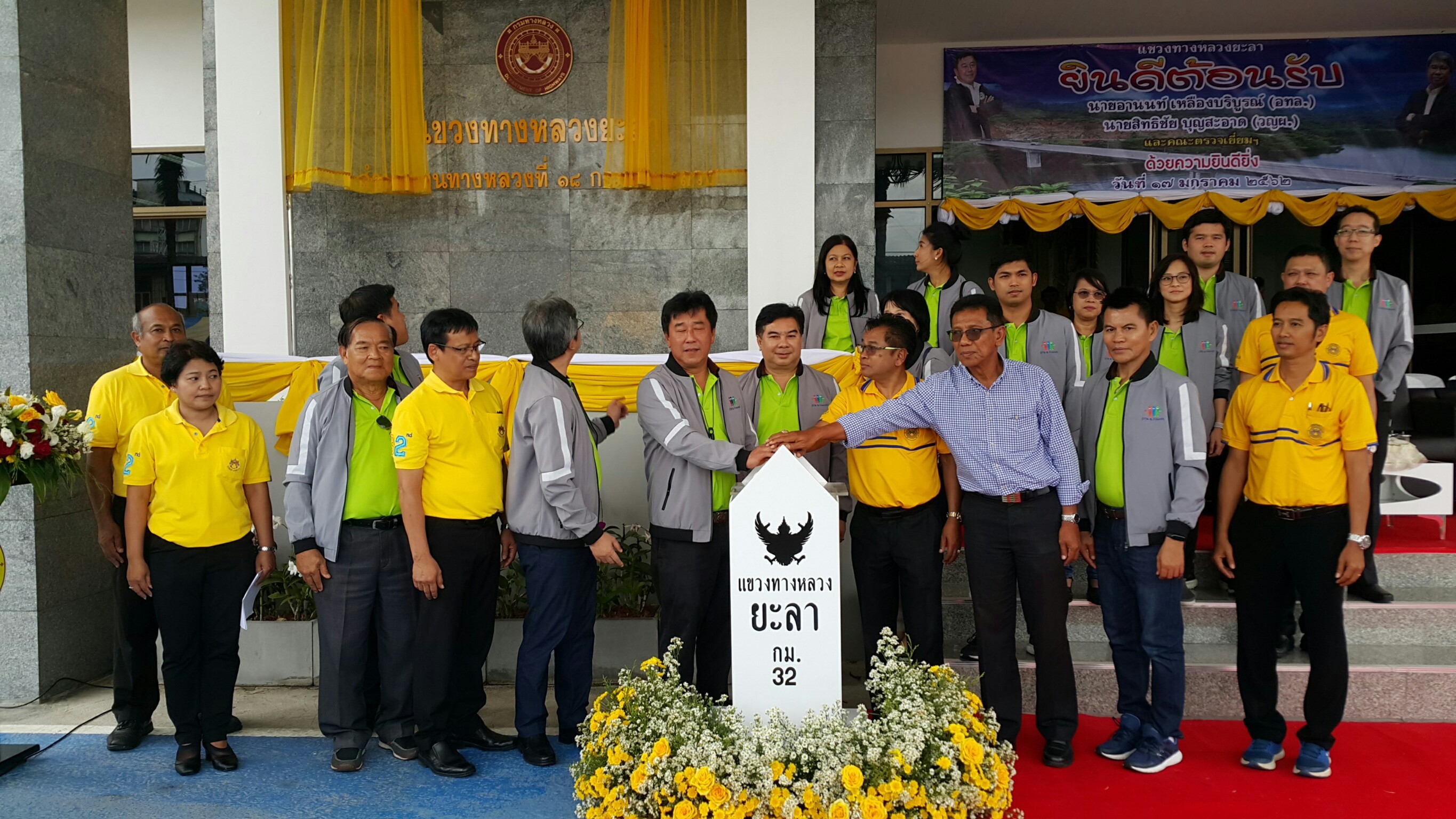 วันที่ 17 มกราคม 2562 นายอานนท์ เหลืองบริบูรณ์ อธิบดีกรมทางหลวง และนายสิทธิชัย บุญสะอาด วิศวกรใหญ่ด้านวางแผนฯ พร้อมคณะผู้ติดตาม ได้เดินทางมาตรวจเยี่ยม เพื่อสร้างขวัญและกำลังใจให้ผู้ปฏิบัติงาน และทำพิธีเปิดอาคารสำนักงานใหม่ โดยมีนายอรุณ เสน่ห์ ผู้อำนวยการสำนักงานทางหลวงที่ 18 และนายสมนึก เศียรอุ่น ผู้อำนวยการแขวงทางหลวงยะลา พร้อมด้วยคณะผู้บริหาร ข้าราชการ และเจ้าหน้าที่ในสังกัด ร่วมต้อนรับ