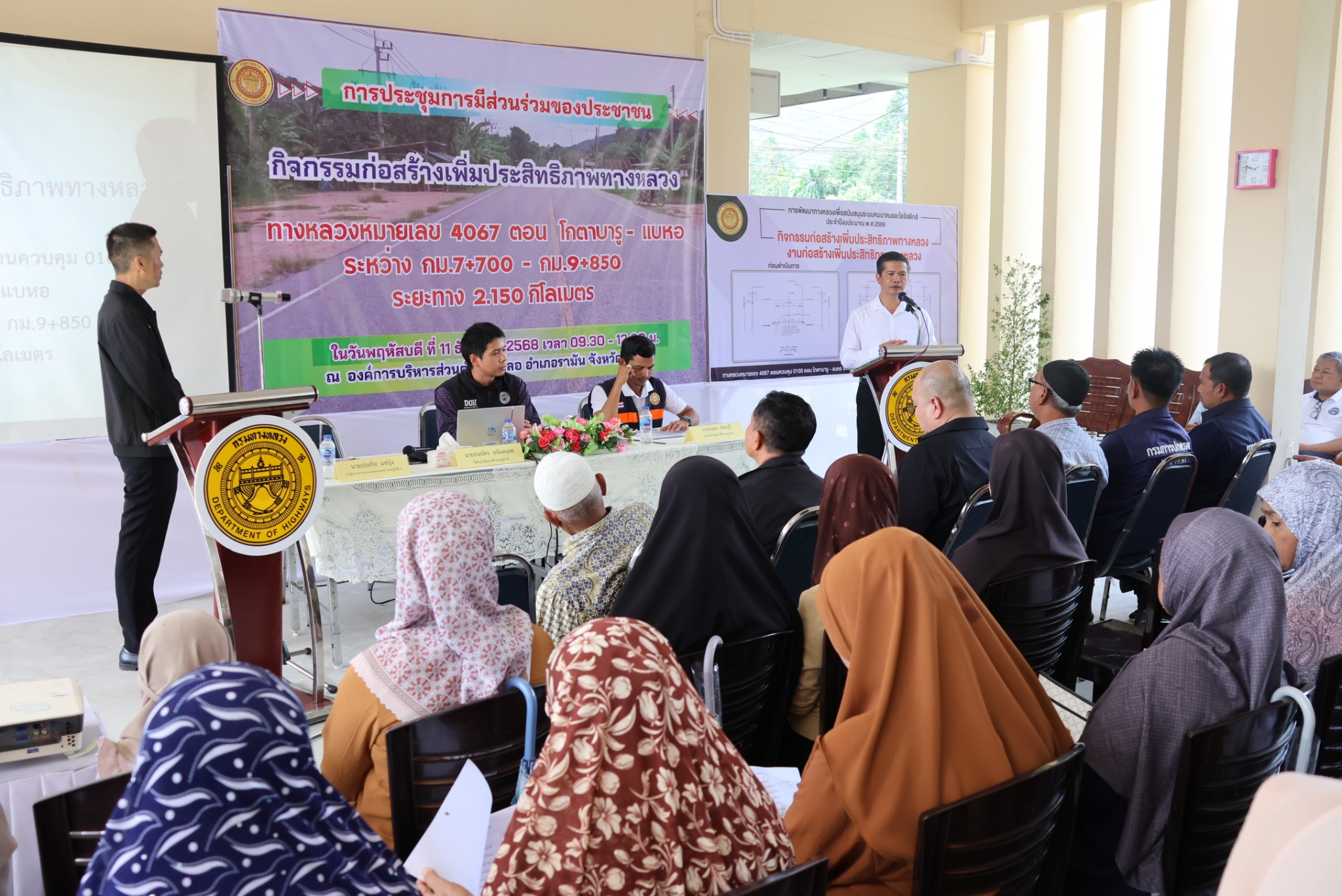 ในวันที่ 11 ธันวาคม 2568 เวลา 10.00 น. – 14.00 น. แขวงทางหลวงยะลา จัดประชุมการมีส่วนร่วมของประชาชน กิจกรรมก่อสร้างเพิ่มประสิทธิภาพทางหลวง ทางหลวงหมายเลข 4067 ตอน โกตาบารู – แบหอ ระหว่าง กม.7+700 – กม.9+850 เพื่อรับฟังความคิดเห็นของประชาชน และนำข้อเสนอแนะต่างๆ ไปปรับปรุงให้สอดคล้องเหมาะสมแก่ประชาชนในพื้นที่ก่อสร้าง ณ องค์การบริหารส่วนตำบลกาลอ ตำบลกาลอ อำเภอรามัน จังหวัดยะลา